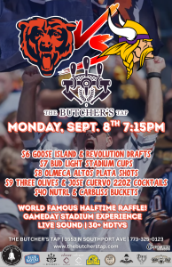 Get ready for gridiron glory as the Chicago Bears face off against the Minnesota Vikings on Monday Night Football at The Butcher’s Tap! We’re turning up the heat in the Southport Corridor with a full-on gameday stadium experience: