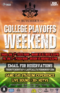 The College Playoffs hit harder with big screens, loud sound, and a packed house. Join us at The Butcher’s Tap for every snap, score, and showdown all weekend long.