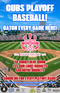 The Cubs are in the playoffs and The Butcher’s Tap is your Wrigleyville headquarters for every big moment. We’ll have the sound on for every pitch, crack of the bat, and rally, so you won’t miss a second of the action.